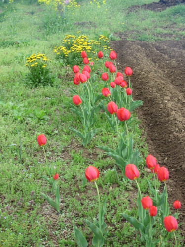 天気予報通り朝から雨が降り始めました。 天気が良ければ田んぼを耕す予定でしたが無理なので、この前伐った栗の木の枝を燃やしていました。もう5月ですね! 今 畑の周りは春爛漫と言ったところです。 あちこちでいろんな花が咲いています。桜はもうすぐ終わりと言いたところですが、チューリップが咲き、芝桜、タンポポ、水仙、桃の花、菜の花、もうすぐリンゴの花も咲きそうです。チューリップ芝桜 去年の震災後に植えたものが咲き始めました。リンゴの花 あと4~5日くらいで咲きそうです。万作の花