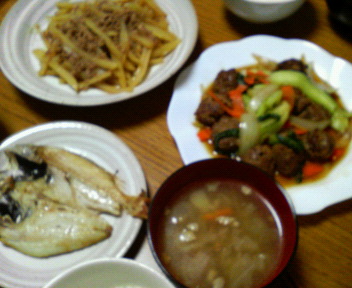 久々の晩御飯ネタです。(まともに作ったのも久々かも・・)ノドグロの干物・肉団子と青梗菜の甘酢あん・ジャガイモそぼろキンピラ・野菜スープでした。ノドグロの干物は白身ですが脂がのってて、我が家人気の干物です。本田おさかなshopさんで【1000円ポッキリ】不揃いだからできる超特価!のどぐろ開き3~8尾合計400g入り!を購入。1セットで6尾入ってました。20センチ弱の割と厚みのあるものが1尾、16~18センチのが2尾、15センチ程の小さめが3尾。小さいのは娘たちに1尾でぴったりサイズです。(丸々一匹食べれて喜んでた)肉団子はゆうぜんさんの手造り牛生ハンバーグを小さめのお団子に握りなおして油で揚げて作りました。(体調不良の際子供とダーリンご飯にハンバーグを焼いて出したんだけど、1個だけ解凍されたのが余っていたので)青梗菜、玉ねぎ、人参を炒めて肉団子を入れて甘酢で絡めて出来上がり。ゆうぜんさんのハンバーグは楽チンお助け材料!今、150gのハンバーグ10個セット送料無料1980円のお得セット販売中です。先日のそぼろサンドを作った時の残りのそぼろを冷凍してたので、それを使ってキンピラです。食後は、妹がお見舞いにと差し入れてくれたプリンこっちではデパートで北海道の物産展でのみ購入できる北海道小樽の有名店「ルタオ」のプリン。週末から待望の物産展だというのに体調不良で行けそうも無く嘆いていたら買ってきてくれました!妹よ、ありがとう~!! コレ、上はちょっと固め下に行くほどトロリとしたプリンです。一番下のカラメルのほろ苦さ加減も最高~一口ごとに進化する味わい~私の一番好きなプリンです。北海道物産展でこのプリンを見かけたら是非お試しあれ!追加です。ルタオの出店スケジュールが地域別で調べられます。(このプリンの扱いがあるかはまでは分からないのですが・・)全国のデパートなどのルタオ出店スケジュールちなみにチーズケーキがココの一番人気みたいですけど、これはまだ食べたことがないです~。