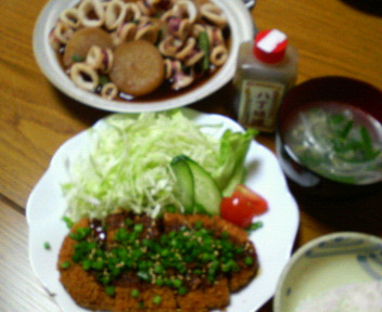 昨日の晩御飯は味噌カツ、大根とイカの煮物、もやしとニラのスープでした。味噌カツはサンシロフーズさんで☆中日ドラゴンズ優勝おめでとう名古屋名物味噌カツ♪送料無料♪のセールをやったとき購入したもの。味噌カツが我が家の食卓に上がるのは初めて。どんな味かな?ちょっとドキドキ。カツに付属のボトル入り味噌ダレをかけて青葱とゴマを散らしました。はい。かなり美味しかったです~味噌ダレがしょっぱくなくて、ご飯が猛烈に進む甘辛度。上の娘は「ぎゃ~!どうしよう まだ一切れしか食べてないのにご飯がもうなくなっちゃった~」と変な悲鳴をあげていましたカツは10枚セットだったし、タレもボトルに半分残っているのでもう一回楽しめます大根とイカの煮物はゆうみゆちゃん家の晩御飯画像を見て猛烈に食べたくなり・・買い物に行ったら大根が1本10円!これは作りなさいって事だよね~。大満足の晩御飯でしたサンシロフーズさんでは勤労感謝セールということでとんかつ5枚、串カツ5本、味噌ダレのセットが送料無料の1974円です。しかもポイント10倍。味噌カツ食べてみたくなった方はいかがでしょう?(残りわずかだったので売り切れてたらゴメンナサイ)
