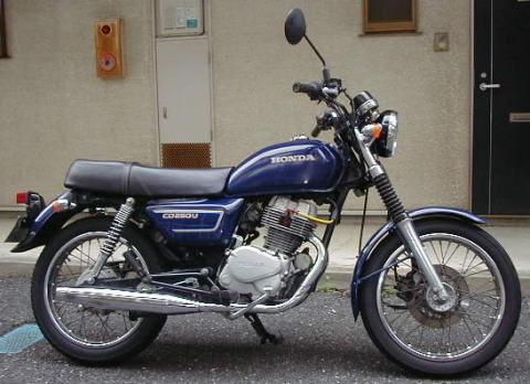 真横から見た写真右前からNGKのプラグコードが入っている外はほぼノーマル。後の原付と比べてみてもらうと、大きさが大体想像できますでしょうか。結構小さいです。ボルティーとかと同じくらいかな?シートだけでなくトップブリッジも低いので、とても前方視界が開けています。キャビーナとは全く異なった世界ですね。メーターもあまり視界に入ってこないので、意識して下を見ないと見えないです。外にも気付いたことを簡単に。・セルのみ CD125Tみたいにキックはなし。・ライトスイッチあり・ポジションランプがついてる・左はスピードメーター。右側のメーターケースにはタコはなく、インジケーター類だけがでかでかと入ってる。なんかカッコ悪い・ハンドルロックがカブのような別体式・クラッチ結構重い・ビジネスバイクなのに1速が高い。半クラ使わないと発進できない・ウインカーはプッシュキャンセルで、CD125Tみたいなピーピー音はしない。無音。・センタースタンドあり。・ツインキャブ・ステップがデカくて丁度足を降ろしたところにあり、かなり気になる。運転中のポジションは最高!・マフラーは二本出しダウンマフラー。ノーマルとは思えない重低音・ダブルシートは乗り心地良好。シングルシートは未体験 前のオーナー曰く、キャリアの立ち上がった部分が加速時に尻に当たって痛いとのこと。・フロントのブレーキディスクは時代を感じさせるソリッドタイプ。効きはまあまあだけど、タッチは今ひとつ。多分ホースのせいかも。・リヤのドラムブレーキはキーキー言ってます・前後17インチのチューブタイヤ・リヤサス調整式・全体的なデザインは至って普通。CD125Tほどクラシックしていませんが、味があります。古いBMWネイキッドみたいな雰囲気。