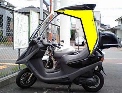 キャビの仕上げはこつこつとやっています。キャブの微調整もだいたい済んで、MJ115 SJ38 AS2+1/4で落ち着きました。低速は若干マッタリ気味にしています。疲れないセッティングになりました。足回り、機関ともに当分このままでいきます。で、車体の方で二つ思いつきが。先日思いついたサイドスクリーン、要は屋根からの雨だれよけです。黒い線の部分は、金属製の棒を曲げて製作。スクリーンと屋根の接合部分のネジを利用して横にステーをだし、支柱の付け根とつないで屋根の剛性も高めます。帆布やビニールクロスなどを、棒とエアロバイザーステー、屋根の支柱に固定して写真のように張ってやればできそう。もう1つは、グリップバイザー。硬化してしまったミラーブーツを撤去して、エアロバイザーからサイドバイザーまでをつなぐ、大きな三角錐状のものをゴム板と金属の骨でつくれないかと考えています。手元に飛んでくる雨の雫と風を防ぐために、ちょっと大型がイイなと思ってます。果たしてうまくいくでしょうか!?