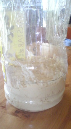 この前失敗したビワ酵母です。(左と右)これは実は大成功の酵母だったのでした。左が発酵前で右が発酵した後の膨らんだ状態です。容器は焼酎なんだけど(笑)厳密に言うと失敗したのは、この後の工程のパン作りの前の状態のときでした。内容は前種の水分を計算から外して水分をたくさん入れてしまったので、全く膨らみませんでした。すっぱい、不味い、最悪の味でした。これがパン?って言う感じでした。天然酵母でパン作りをするときのイメージは、酵母液を作り酵母を作ると言うイメージではなく、酵母液でいきなりパンを練るという方が理解しやすいと思います。それで酵母液で小麦粉を練るとこれがまた良く膨らむのです。それをさらに小麦粉を混ぜ直接最初の練りとして、作ってみるとこれがまた良いのです。(下)は干葡萄酵母で完成したものです♪やってみてわかったのですが、酵母をたくさん作ったら水分と小麦粉の割合が厳密に量れず分量が適当になってしまい失敗すると言うか安定しない事が多いと思います。
