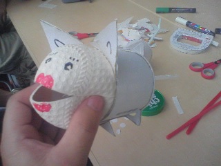 今日は朝から明和電気展に行ってきました。でもちょっとイメージとは違いました。作品は展示されてるんだけど、ほとんどが見るだけで、触れない。また実演もビデオがほとんどで、経費を抑えてるんだろうけど、少し物足りない感じでした。で、30分ほど見学したあと、チワワ笛の会場に移動しました。そこで愕然・・・・なんと8割が小学校以下のお子ちゃま達・・・。結局みんな作れず、保護者が作ってる。なんかイメージとは、かなり違いました。でも面白いのが、僕は結構良い音が出てたんだけど、出せないお父さんは顔色変えて本気で作ってました(笑)。無理しなくていいのにね(笑)作り方は簡単、チップスターの容器、ストロー、風船、ゴムボールを工作して組み立てて完成でした。こっちの方が展示より面白かったです♪