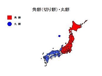 さて、この丸餅、角餅の分岐点は日本海側では灯油のポリタンと同様に富山県か?調べてみると、高岡市は角餅なので、ほぼ富山県全域が角餅、石川から丸餅ではないかと考えられる。このあたりから、南の滋賀県と三重県にかけては、いずれも角餅と角餅が混在しているようで、滋賀はほぼ丸餅だが、一部角餅の地域があるようで、三重は北から、四日市は混在、鈴鹿は切り餅、津は切り餅、名張・伊賀は丸餅、松阪は切り餅、伊勢は混在という状況になっている。滋賀県と三重県の場合は、昔の藩によって異なるようで、徳川派は角モチ。豊臣派は丸モチという説もある。このへんは、サンプルが少ないので、当該地域の方からの情報をお待ちしたい。但し、東日本でも山形の庄内(酒田や鶴岡など)は丸餅である。これは西回り航路で関西とのつながりが強かったためだ。高知は山内一豊の影響で、鹿児島も理由は定かでないが角餅も多く混在地域である。