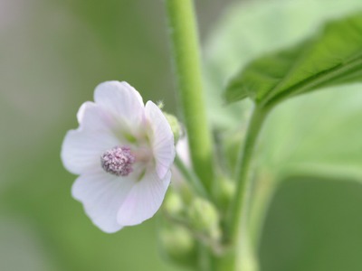 マーシュマロウこのハーブは背丈が高く支柱をしてあげないと雨にたたかれると倒れてしまうの今50~60センチになってますそろそろ支柱の用意をしないとねやさしい色のお花が心を癒してくれる葉っぱはビロードみたい名前からマシュマロを連想しませんか?そうなのよマーシュマロウの根の粉末と砂糖で作られたのがマシュマロの始まりですって今はゼラチンで作りますよね口内炎や咳止め、のどの炎症を改善してくれるお花も葉っぱもテイーにして…若葉はサラダにどうぞ花言葉 :温厚、慈善、優しさ