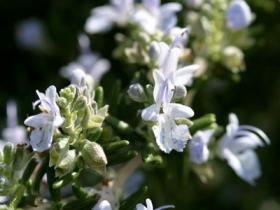 ローズマリー属名はロスマリン「海のしずく」を意味する花言葉は「記憶・想い出」ハーブの中でも一番のお気に入りはローズマリーなのお料理にもよく使いますお魚のムニエルにかけるバターソースにこのハーブを加えるといいですよ…鶏肉をソテーした時にもよく使います…1370年ハンガリのエリザベス女王のために作られたというハンガリー水はこのローズマリーを使っています作り方はネットで検索して下さいね。もちろんお風呂にもどうぞお肌が若返ります☆ローズマリー・ハニー☆蜂蜜300グラムは80℃ぐらいで湯煎にする。清潔なビンにフレッシュ・ローズマリーの小枝2本(洗ったもの)を入れて蜂蜜を入れる。冷めてから蓋をして、一週間から10日ほど置きローズマリーの小枝を取り出す。※スコーンやトーストにどうぞ!牛乳や紅茶にもいいわよ!シェイクスピアの『ハムレット』のオフェリアの有名な台詞にもローズマリーが出てきます"There is rosemary, that's for remembrance; Pray you, love, remember,that's for thoughts.,"これがローズマリー、ものを忘れぬようにする花よ、わたしを忘れないように……ね、お願い、いつまでも、