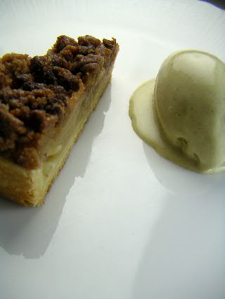 ショコタ;こんばんは。ショコタです。今日は紅玉のタルト補足説明です。以前の日記に書くのを忘れていたのですが、クランブルタルト(その1)の方は一緒に盛り付けて食べたいアイスクリームが決まっていました。普段ならクランブルにシナモンの香りは付けないのですが、今回はアイスクリームとの接点として微量のシナモンを添加しました。アイスクリームは五香粉のアイスクリームです。中国のミックススパイスでおなじみですね♪ ウーシャンフェンと言った方がなじみ深いでしょうか。 昨日の晩ごはん、五香粉をまぶした鶏のから揚げにしました♪おいしいかったです。チヨコも大喜び!!あっ、晩ごはんの話はいいですね・・・アイスは濃厚なタイプでなく、さらりと仕上げてあります。 もちろん、舌にしっかりと乗ってくることを前提にした軽やかさです。 アイスクリームマシンは以前ご紹介したあれです。 昨日チヨコと紅玉のタルト2種に五香粉のアイスをそれぞれ組み合わせて食べてみました。人参と紅玉のタルト(その2)は寝かせたことによって、 人参が高貴な(?)香りを放っていて美味しくなってます。今回のアイスクリームとの相性はいまひとつでしたが・・・同じ方向を目指していないし、ぶつかり合って新しいものが生まれてくるでもありませんでした。その1のクランブルのほうは見るからに合いますでしょう♪クランブルにも五香粉にもシナモンが入っているわけなのですが、分けて使うことで風味の感じ方に時間差のようなものが生まれてくると思うのです。何かが消えたやさきに何かが現れてくる。 食べながらリズムが生まれてくるような感じを狙いたい。ここに松の実をカラメリゼしたものを散らしたかったのですが在庫切れ。。残念。リンゴと松の実を合わせるのも好きです。こんな画像いらんとちゃう? アイスクリームはスプーンが抵抗なく入るように 温度を調節しておきたいですね♪