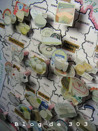 ショコタ;こんにちは。ショコタです。何だかわかりますか?我が家の壁に貼られているフランス地図です。フランスチーズが好きなので、チーズ地図・・・駄洒落じゃないですよ。紛らわしいのでフロマージュ地図にしましょう。キーを打つ回数は増えますが・・・あのルッコラ日記のイラストで好評の(?)チヨコ作であります。ダーツみたいでしょ。フロマージュの矢が刺さっているんです。全てのフロマージュを網羅すると地図としての機能とインテリアとしての外観を果たさなくなってしまうので(笑)、とりあえずAOC(原産地呼称統制)のフロマージュに的を絞っています。お見せできないのが残念なのですが、チヨコのフロマージュ・ノートはすごいです。何がすごいって、フロマージュのイラストがスゴイ!!(地図上のチーズは写真です。)ひとつひとつ、色鉛筆で描いてあるのです。それぞれの特徴が単純化されてます。ノートの方はフランスチーズを中心にイタリアチーズもまとめてあるので良い資料になります。時々登場する牛や羊、山羊のイラストもスゴイ!!!どれも犬みたい!!(笑)。常時40種類以上のフロマージュがワゴンに乗って出てくる、とあるレストランにおいては、まだまだ見破れないものが山ほどありますが、チヨコのノートのおかげで割とスムーズに頭に入ってきます。MOF(フランス国家最優秀職人)チーズ熟成士のチーズがネットで購入できる現在です。ありがたく楽しみたいものです。これパズル遊びもできる!!が、やたら外すと怒られますが・・・