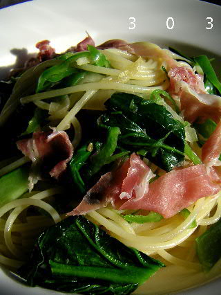 【 小松菜と生ハムのスパゲッティー 】こんにちは。ショコタです。昨晩、熟成途中の返しを使って早くも蕎麦を頂きました。ダシをとって返しと合わせ、それをしばらく火にかけて馴染ませます。決して沸騰させずにゆっくり熱を加えることで、合わせたときには感じられない厚みがでてくるから面白い♪合わせたてのつゆの味は、蕎麦つゆにしては薄く、しゃばしゃばしているが、加熱することでその味わいはぐんと深みを増すように思われる。うつらうつらしていた返しが目覚めたようです。今回は85℃~90度の温度帯で加熱を続け、味見を繰り返し液体に厚みが感じられたところで火から外し冷す。準備OK。うまい!蕎麦が引き立ちます。。どう美味しかったのかは、またの機会に!(目がショボショボするので・笑) 今朝はこの返しに味醂を少し足して卵丼にしました。親子丼にしたい!くらい、美味しかったぁ♪?・・・・写真は蕎麦でも卵丼でもありません。本屋さんと八百屋さんにチヨコと出かけ買い物を終えて帰宅したのち、(野菜を買い込む・喜)目についたものでさっと作ったパスタの画像。生ハムと小松菜、ピーマンのスパゲッティー。甘い小松菜とピーマンの青い香りと生ハムの熟成香を取り合わせてみました。玉葱の役割も忘れちゃいけないな。少し入ってます。じっくり静かに火を入れた玉葱が・・・