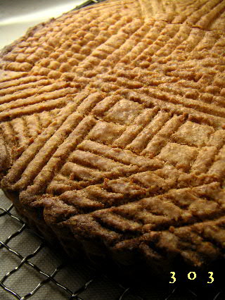 ショコタ;こんにちは。ショコタです。今回のガトー・バスクの断面です。夏のバター使いもやっかいなものですが、この寒い季節、室温10度の台所にてバターを滑らかなクリーム状にするのは意外と大変なものです。(タルト生地やパイ生地をのすには好都合なのですが・・・)当然、室温に放置しておくだけでは柔らかくならないので熱を与えるわけですが、ガトー・バスクのような素朴なお菓子を作るにあたって湯煎やら電子レンジやらの出番は大げさなような気がしてなりません。フードプロセッサーなど洗い物が増えるだけです(?笑)。そこで今回のガトーを作るうえで(僕にとっての)最大のポイントは“手”です。ホイッパーも木べらもゴムべラも使いません。冷たいバターを大きめのボールの中で押しつけるようにして練っていきます。砂糖を加えてさらによく練ると、クリームのように柔らかくなってきますのでリンゴでもつかむ感じで指をゆったりと開き、お米を研ぐ時のようなリズムでバターと砂糖を攪拌していきます。卵を乳化させるのも簡単です。卵はときほぐすことも室温に戻す必要もなし、クレメしたバターの中に1個ずつ落としキーボードを連打するごとく、指先を刻みに動かすと同時に混ぜていくとあっという間に乳化します。あらかじめ篩っておいた粉を入れて、握手をするときに差し出す手のひらの柔らかさで粉をさっくりとあわせていきます。室温の低さと僕の体温が生地をいい状態に保ってくれます。後片付けも楽ですし何より楽しいのは手のひらから伝わってくる感触です。バター、砂糖、塩、卵、アーモンドパウダー、粉、それらの素材が加わるごとに様変わりしてゆく生地の肌合いを直に感じるのが楽しいのです。ホイッパーやゴムベラからは得られない繊細な刺激に心弾ませることができました。楽しく作ったものだもの、美味しくないわけがないのです♪そうでしょ?
