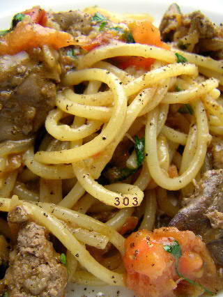 【 鶏レバーのスパゲッティー 】ショコタ;こんばんは。ショコタです。鶏モツをたっぷり頂いたのでガッツリとパスタに使いました。●材料鶏レバー、ハツ、玉葱、ソフリット、トマト、シェリーヴィネガー、醤油、バルサミコ、イタリアンパセリ、塩、胡椒、カイエンヌペッパー、ニンニク、無塩バター、オリーブオイル鶏レバーと心臓をきれいに掃除して軽く水洗いします。水気を拭い、塩、胡椒、オリーブオイルで調味。スライスした玉葱(レバーの1/5くらい)をバターとオリーブオイルでやさしく炒める。しんなりしたら小指の爪半分くらいのニンニク(みじん切り)、ソフリットをいれる。玉葱が甘くなってきたら脇に寄せてレバーとハツを投入。じっくり焼く。シェリーヴィネガーを数回に分けてふりかけ酸味を飛ばし風味を加味すると共に全体の輪郭をひきしめていく。フライパンの縁へ、ざく切りにしたトマトを置きいれる。ここまでフライパンを揺する必要はない。バルサミコと醤油少量。(ここらでパスタが茹で上がる寸前♪)カイエンヌと塩で味を調え再確認。トマトの水分が出てソースとしての濃度を保っている状態だが、詰まり過ぎて全体が重いようなら茹で汁を加えてのばす。茹で上がった太目のパスタと刻みたてのパセリを加えあえて出来上がり。ワインは昨日飲み残したルイ・ジャドのムーランアヴァン♪