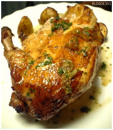 焼き脂を絶えずお肉にかけながら、じっくりと焼き上げた鶏です。ソースなんて言えるほどのものではないですが、フライパンに付着しカラカラになった肉汁を白ワインを加えキレイに煮溶かし、シャンパンヴィネガーとパセリを加えて仕上げ♪(続く予定。。)
