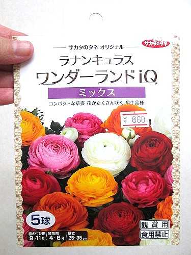 こんにちは!編集者Aです。今日も個人的に気になっていた商品をご紹介します。しかも、かな~り長い間気になっていたけど買うか悩んでいた商品なんです。すごく綺麗で育ててみたかったんですけど、こんなに綺麗なんだから、きっと育てるのが難しいんだろうな~、無理か~ってでも、今日とうとう買っちゃいました~ その気になっていた商品はこちら。サカタのタネさんの ラナンキュラス ワンダーランドiQ ミックス パッケージの裏側です。 パッケージの裏側の説明です。ブログに掲載するために早速開封しちゃいましょうなるほど、横幅1.5cmぐらいの小さめのものから、3.5cmぐらいありそうな大きいものまで、全部で5球の球根が入っています。植える時は、説明に書いてあった通り球根の上と下に注意ですね家に帰って植えるのが楽しみだ~と思っていたのですが、先ほどちょこっとラナンキュラスの球根の植え方を調べたところ、なんだか気になる言葉が・・吸水処理・・え、何それどうやら販売されているラナンキュラスの球根は乾燥した状態になっていて、このまま植えてしまうとうまく水を吸収できなくて腐ってしまうこともあるとかなので、いきなり土に植えてしまうのではなく、布やキッチンペーパーなどを湿らせたもので軽く覆って、直射日光を避け風通しが良い涼しい場所に数日置いておく方が良いらしいです。「数日」ってどれくらいなのかも調べてみましたが、2~5日程度と書いてあったり7日間ぐらいと書いてあったり様々でした。保管している場所の気温にもよって変わりそうですね。他には「球根の見た目が水を吸ってふっくら大きくなったら」というのも目安になるそうです。ただし、吸水しすぎや湿気が多すぎると腐ってしまったりカビが出てしまうことがあるので要注意です 少し近づいて撮影すると・・なるほど、たしかにカサカサに乾燥してますね。よし、家に帰ってまずは吸水処理からやってみようそういえば、以前店長がこの吸水処理をやってみたそうです。新聞紙をかる~く湿らせて、球根を包んでお店に置いていったら、次の日には新聞紙がカピカピに乾いていたそうです。ダメじゃん「簡単に乾かない、もう少し布っぽいほうがいいかもね」と経験者は語っておりました。うん、そうだね。ちなみに、お店のお花たちを管理してくれているY姉さんにラナンキュラスについて聞いてみたところ、以前吸水処理をしないで植えてみたことがあるとその時は、普通に芽が出て、成長してお花もしっかり咲いたそうですただし、気を付けたこととして「最初はお水をしっかりあげたけど、その後はジャブジャブあげちゃダメ。球根が腐ってしまうから」ということです。やっぱり「初期段階の球根に水」って、加減が大事なポイントなんですねさて、家庭菜園超初級者の編集者Aが吸水処理を無事に完了させることができるのでしょうか球根の運命やいかに (もちろん大事に育てますよ)それでは、また ↓こちらは当店トップページです。家庭菜園用、直売店用、伝統野菜、プロ農家向き、新品種など、他にもたくさんの種を取り揃えております。