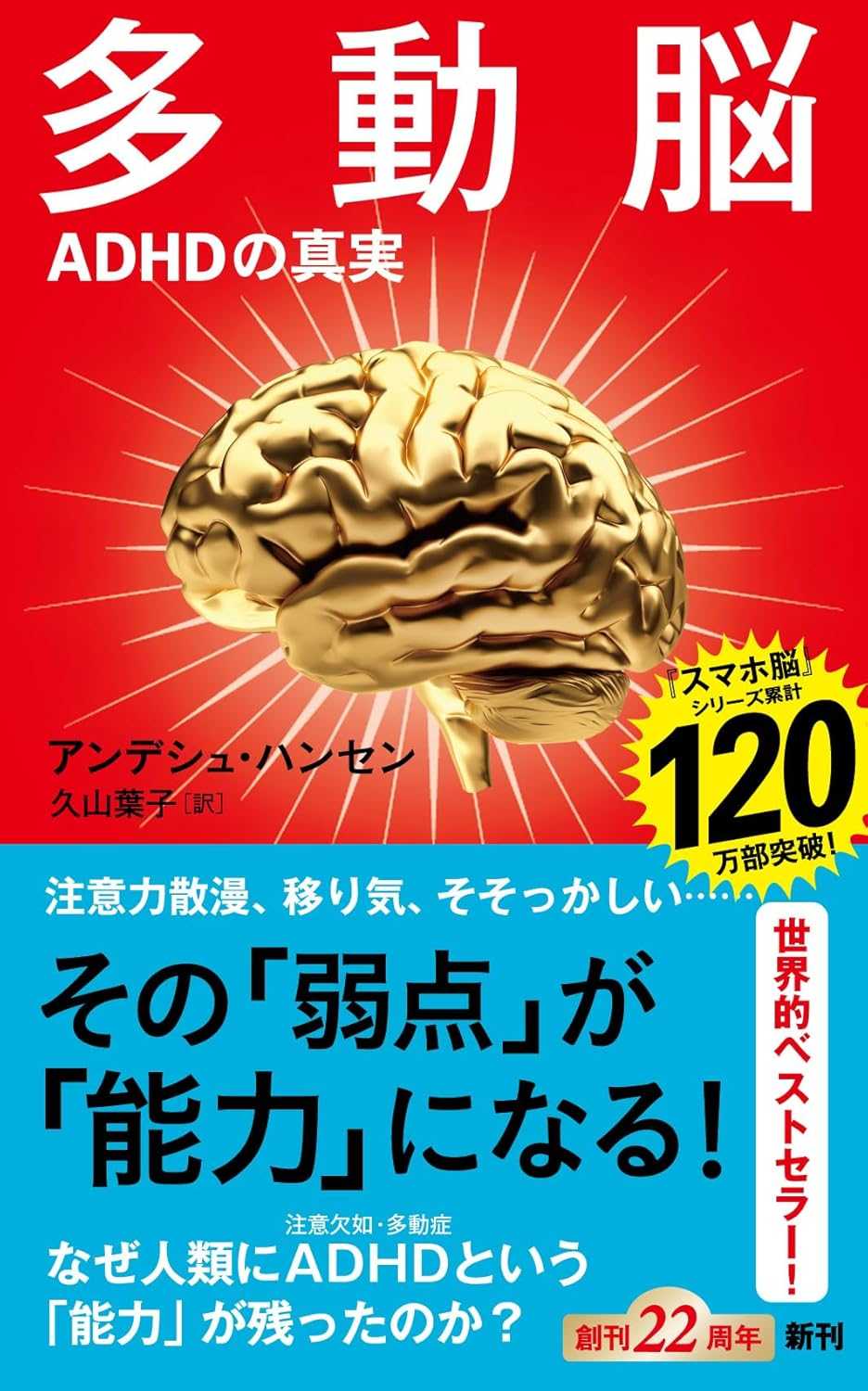 シリーズ120万部突破!『スマホ脳』著者が問う「なぜ人類は進化の過程でADHDという〈能力〉が必要だったのか?」生きづらさが強みに変わる世界的ベストセラー!教育大国スウェーデンの学校現場でも読まれています!注意力散漫で移り気で、そそっかしくて人の話を聞かない。なのにクリエイティブで粘り強く、探究心旺盛でハイパーフォーカス能力があったりする……心当たりがありますか? あってもおかしくありません、誰でもADHDの傾向はあるのだから、と精神科医の著者は言います。ではなぜ人類の進化において、そんな「普通とはちょっと違った」脳が生き残ったのか? いまやクラスに2人?注意欠陥・多動性障害と呼ばれていたADHDは現在、注意欠如・多動症と呼ばれています。国立精神・神経医療研究センターによると「診断される子どもの割合は学童期の子どもの3~7%」、35人編成のクラスなら、2人いておかしくない数字です。日本では「成人でも診断に該当する人の割合は2.5%」とのことですが、スウェーデンでは全人口の5~10%、アメリカでは子どもと若者のおよそ8人に1人がADHDだとする調査結果もあり、診断数は増加の一途を辿っています。●ADHD傾向は実はみんなにある?●なんで飽きっぽいのに超集中もできる?●食生活やしつけのせい?●なぜクリエイティブだったり起業家向き?●なぜADHDが増えている?精神科医でベストセラー『スマホ脳』の著者がわかりやすく、その謎と〈強み〉を解説します!【日本の読者の皆さんへ(抜粋)】 スウェーデンで刊行されて以来、「この本に救われた」という感謝の言葉をたくさんもらった。自分や周りの人のことを理解できるようになり、ADHDの〈強み〉をうまく使いこなす術を身につけられたという人が多い。著者として、また精神科医として、その言葉を聴けるのは本当に嬉しい。この本が日本の読者にも役立つことを願っている。 ――アンデシュ・ハンセン【本書より(抜粋)】 これほど多くの人が多動で、衝動的で、集中が困難なのはなぜだろうか。子供にも大人にもそんな特徴が見られ、最近よく話題になるADHDの診断が下りる根拠になっている。しかしADHDが問題でしかないなら、進化の過程でADHDの人は消えていたはずだ。では今でもADHDの人は大勢いるのはどういうことだろうか。 そもそもADHDとは何なのか──。 集中力を保てない/すぐに気が散る/指示通りにやるのが苦手/人の話を聞けない/整理や計画ができない/じっと座っていられない/頻繁に相手を遮る/自分の番を待てない/じっとしていられない/そわそわする。エンジンがかかりっぱなしで、常にスイッチが「オン」のような状態/絶えず刺激を必要とする/貧乏揺すりをしたり、物をいじったりする 心当たりがあるだろうか。あってもおかしくはない。誰にでも多少その傾向があり、私たち全員がADHDのグラデーションのどこかにいる。ただ、私のようにADHDの傾向が強くてグラデーションの濃い所にいる人もいれば、淡い所にいる人もいる。傾向が強い人の場合は大きな問題が生じているかどうかがポイントになり、それでADHDの診断が下り、治療の対象になる。 ここでもう一度先ほどのリストを見てみると、どれも問題になって当然のことばかりだ。そもそも診断が下ること自体問題が生じているからだが、ADHDには問題ばかりではない。 そのことを本書では述べてゆきたい。【「目次」より】日本の読者の皆さんへまえがき──ADHDには〈強み〉がある 第1章 ADHDって何? 第2章 この世界は退屈すぎる!第3章 人類の放浪と〈ADHD遺伝子〉第4章 遺伝子と好奇心 第5章 ぼんやり脳はクリエイティブ第6章 ハイパーフォーカス脳第8章 運動は天然の治療薬第9章 人間は学校に不向き?第10章 ADHDが増加するわけあとがき用語集参考文献謝辞訳者あとがき[著者]アンデシュ・ハンセン(Anders Hansen) 1974年スウェーデン生まれ。精神科医。ストックホルム商科大学で経営学修士(MBA)を取得後、ノーベル賞選定で知られる名門カロリンスカ医科大学に入学。現在は王家が名誉院長を務めるストックホルムのソフィアヘメット病院に勤務しながら執筆活動を行い、その傍ら有名テレビ番組でナビゲーターを務めるなど精力的にメディア活動を続ける。『一流の頭脳』は人口1000万人のスウェーデンで60万部が売れ、『スマホ脳』はその後世界的ベストセラーに。『最強脳』『ストレス脳』『メンタル脳』など日本での著作は累計120万部を突破している。[訳者]久山葉子(くやま・ようこ) 1975年兵庫県生まれ。翻訳家。エッセイスト。神戸女学院大学文学部英文学科卒。スウェーデン大使館商務部勤務を経て、現在はスウェーデン在住。