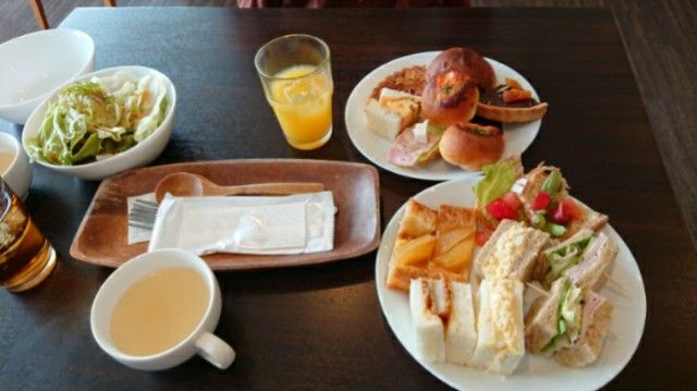 それらと、サラダ、スープ、ジュースはオレンジ、アップル、コーヒー、紅茶。