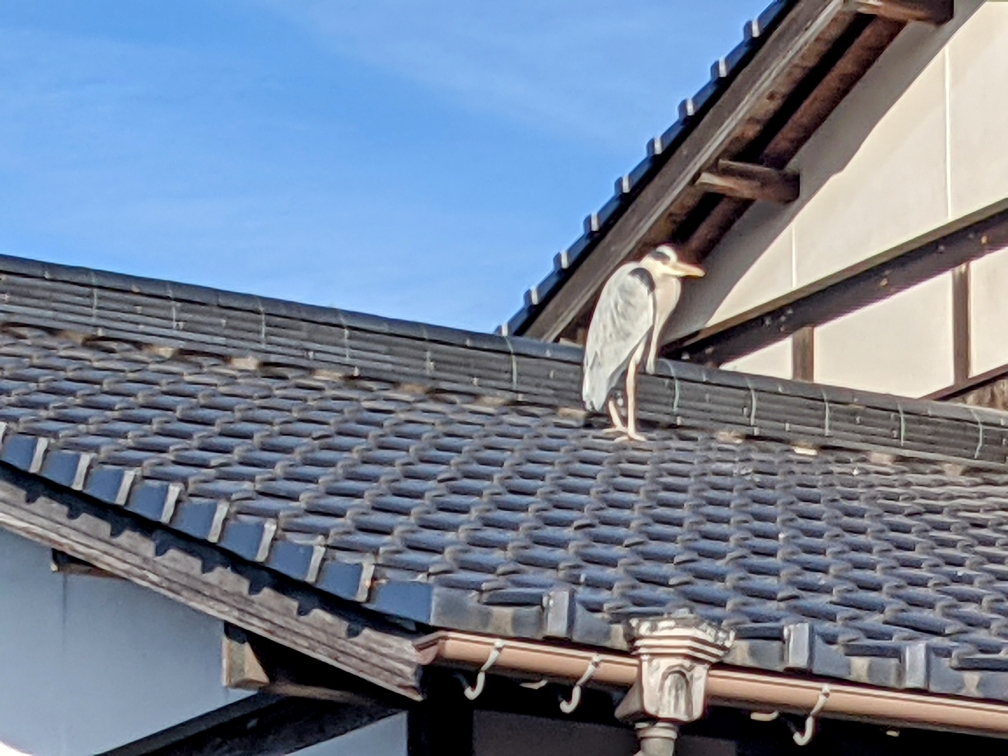 最近の畑遊びは、「生ゴミ埋め込みと草取り」ばかりでこのオジサンは、少々腰が痛くなってきた😢 ※腰を下ろした作業ばっかでで、「今日は休め!!」と、家内が言うので 昨日は、土遊びはサボったオジサンてした今朝の散歩🐾👫もバッチリでした我が家を飛び出して40分程すると雲で覆われていた空が明るくなりましたても、今日は【雪❄】が降るかも・と、言われています昨日の午後から散歩🐾🚶で屋根の上でくつろぐ「アオサギ」がいましたこのお家の裏には「水路(この時期は余り水は流れてない)」が有るので屋根の上から、監視してるのかな?😁