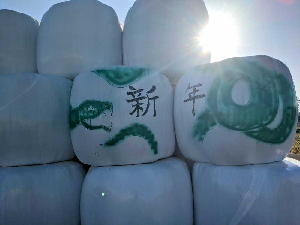 この正月は、子供や孫達が来ないので元旦も普段通りの早朝散歩🐾👫をキッチリとやって来た❗️いつも通りに日出前に帰り着いて、後はノンビㇼと過ごした午後から散歩🐾🚶では、面白い物が目に飛び込んで来た稲藁をグルグルに巻いて牛さん(牧場)の保存食料ですがそれに楽しい「新年の落書き(?)」挨拶画が描かれていた "いいね〜、いいね〜、楽しくなるよな〜"戻ってから、早速家内に画像を見せた😂 ※ 元旦は「朝、午後」の散歩で1,5万歩超歩きました