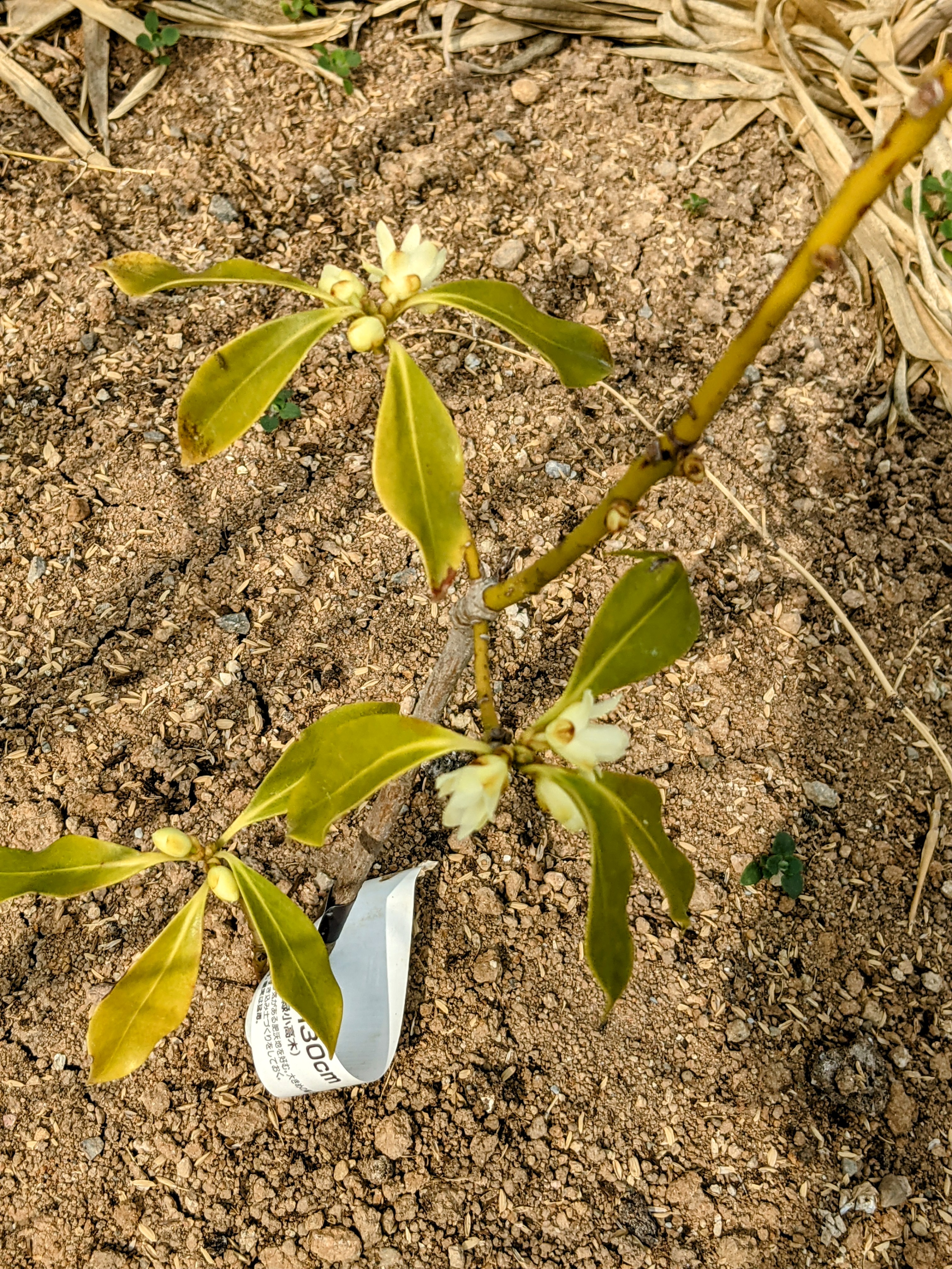 外通路に植え込んだ【樒(シキミ)】に、花が咲いていた