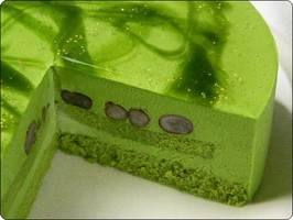 天保7年創業の京都・宇治のお茶の老舗から、夏にふさわしい柔らかい抹茶のチーズケーキ。こだわりの味いっぱい!です。京都・宇治・お茶の森半森半の茶師が選び抜いた風味豊かな宇治抹茶を使い、口どけなめらか、軽いムース仕立て・・・抹茶ペーストの素敵なマーブル模様に金箔がちりばめられているんです!♪抹茶レアチーズムースケーキ [ふうわり、なめらか、軽いムース仕立ての抹茶チーズケーキ]