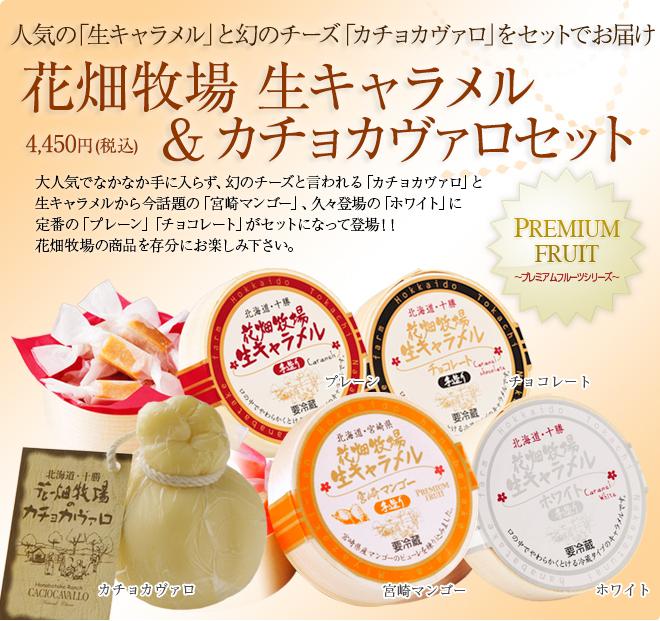 北海道発の牛乳にこだわった手造りブランド「花畑牧場」から北海道産の生乳で造ったこだわり素材の名品です。口に入れた瞬間溶け出す、新食感の生キャラメル花畑牧場 生キャラメル&カチョカヴァロセット今話題の「宮崎マンゴー」とホワイト・プレーン・チョコレートの定番フレーバー、幻のチーズのカチョカヴァロのセットだから、いろいろ試せてうれしい。◆定番お試しセットもあります。口に入れた瞬間溶け出す、新食感の生キャラメル【送料込】花畑牧場 生キャラメルお試しセットプレーン×1箱、生キャラメルクリームx1個、生キャラメルプリンx1個