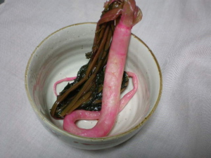 京都の伝統野菜・「日野菜」京都には、「京の特産野菜」、「京野菜」、「京の伝統野菜」があります。この「日野菜」も「京都らしさを含んだ、京都を代表する野菜」という意味の伝統野菜です。もともとは日野菜はその名が示すとおり滋賀県日野町を発祥地とするカブラの一種です。室町時代の日野の領主・蒲生貞秀公が、日野の鎌掛(かいがけ)という地域で野生菜を発見し、その菜を漬物にしてみると、色、味ともに風雅なものであったため、京の公家に贈り、時の天皇に献上されました。さっぱりとした赤カブのような味わいで楽しめました。