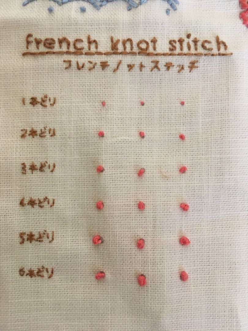 今回練習したステッチはバックステッチ、アウトラインステッチ、フレンチノットステッチ、サテンステッチの4種類。