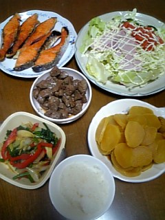 今日は買い置きしてある鮭を焼いて、チャチャッと そしてチョイチョイッと 簡単夕飯です。 鮭を焼いて たくあん切って あるもの炒めて終わり~上の二人は 頑張ってバイトで働いています。明日から大学が始まりますので、 いつも通りのお弁当作り 頑張ります・・・・ にほんブログ村にほんブログ村 米沢牛サイコロステーキ 200g チビは 今日も部活の練習試合のため お弁当でした。最近写真撮るの忘れちゃってUPできませんが、 昨日も一昨日も 息子のためにバイトのお弁当作りでした。明日は 4人がお弁当です。早起きできるように早く寝ますねー 今日はいつにも増して 寒いです。昼間もお風呂入ったのですが、 寒くてぞくぞくしちゃいます。早く春にならないかなー