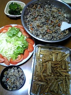 こんばんはーなんて今日は寒いんでしょう・・・・空気が冷た過ぎです 血色の悪い娘たち、そして貧血のパパのために、ひじきたっぷり混ぜご飯です。5合のご飯ぜーんぶ混ぜご飯です。一人1合? 竹の子が入っています。買い物しないであるもので作ったので、 シメジやこんにゃくが入ってません。ひじき 人参 竹の子 鶏肉がいっぱい入ってますよー 食パンの耳ではないですよーゴボウをフライドポテトのように細長く切り、から揚げ粉と小麦粉をブレンドしてまぶし、 カラッと揚げました。塩を振っていただきます。 ゴボウ太くて長いのを4本も揚げたのに揚げるそばから無くなっていくよーおつまみにもいいよねー にほんブログ村にほんブログ村 香り高いごぼう本来の香りをご堪能下さい北海道産 有機栽培【ごぼう】 今日は早く起きて お弁当です。から揚げをあげて、 ハムエッグ 卵焼きなどを詰めました。朝5合 夜5合のご飯を食べつくします。作りがいがありますねー 明日も早起きしますよーああー ゴボウスティックが止まらない・・・・笑