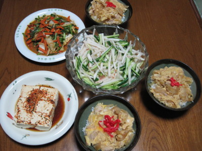 こんばんはー今日はいいお天気で もうどうしましょ~ってくらい動きまくりましたよ。布団もふかふか 洗濯物のピラミッドすごいすごい・・・・畳んでも畳んでも 減らないの(笑)で、 長女がお休みなので、今夜の夕飯はお任せです★ 大根のサラダは 梅ドレッシングでいただきます。えーっと 白菜と人参 ニラの炒め物もあります。親子丼 汁ダクでいただきました洗濯物が整理出来たら、夕飯ができていました。。。 助かる~ご馳走様でした にほんブログ村にほんブログ村 蒸らして美味しい親子丼親子鍋のフタ 今朝は3時半に起きたら 寝れないの・・・・そのまま パンをセットしたり、コーヒー飲んだりしちゃったので 一日が長いです★早く寝れるといいんだけど