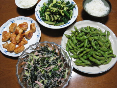 おはようございます。昨夜は早くに食べて 早寝しちゃいました。お腹一杯になると寝ちゃいますね。笑 昨夜はあっさりめの晩ごはんです。酢の物がメインですよーきゅうりの浅漬けもありますよ。鶏肉は揚げずにから揚げ~なので フライパンで焼いただけ・・・・ 私 コカ・コーラ公認ブロガーを継続させていただいていますが、第1回のテーマは 「忙しいときに、ぱぱっとできる!我が家の簡単レシピ」 です。給料目前! 節約レシピ プラス一品に最適!定番のおかず家族で行くお出かけ お弁当メニュー子供が喜ぶ ランチメニュー夏バテ解消レシピまたあとでいろいろUPしますね。 まさに今夜は 「忙しいときに、ぱぱっとできる!我が家の簡単レシピ」簡単でおいしい酢の物~春雨 わかめ ハム きゅうりを甘酢で和えただけです。味付けは砂糖 酢 醤油 サッパリーあまり甘くしないのがポイント★ パパは食べる直前にさらに 昆布ポン酢をかけてるー 酢をとると かなり調子いいです。夏はさっぱり 酢の物いいですよね。 にほんブログ村にほんブログ村 早いですね、もう週末★素敵な週末をお過ごしくださいね。