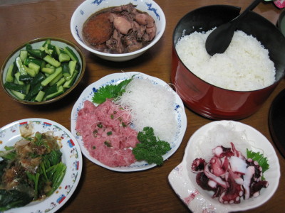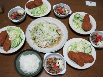 こんばんはー今日は暑かったですね~揚げものしたので キッチンはものすごいことに・・・・・暑い~ 今夜は白身魚のフライでーす。白身魚のフライ 海老クリームコロッケ イカフライのどれか2個食べてよーし★みんな迷っちゃうんだけどね ひじきご飯にしようかと ゴボウや人参 鶏挽肉など いろいろ入れて煮たのだけれど・・・・そういえば この間混ぜご飯したし、 ご飯食べ過ぎちゃう・・・・ということで おかずで食べまーす。茹で卵と一緒にね。。。真ん中にドーンとあるのは 玉ねぎ 大根のサラダ バジルドレッシングでね 6時に帰ってくるチビチャンが お腹空いたーっと帰ってくるので、早めに準備しちゃいますよ。おいしー おいしーって食べてくれるので 作りがいがありますね。みんな早く帰ってこーい にほんブログ村にほんブログ村 今日は病院の日・・・・調子はOK買い物したり 午前中は忙しかった~ 今日は 生姜の日みたいですよ。パパには 冷奴におろししょうがたっぷりのせちゃおうかなー