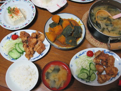 こんばんはー今日は一日 雨が降ったり止んだり・・・・寒いですね。今夜はから揚げと かぼちゃデース★いつもは鶏胸肉を使って揚げますが、今夜はもも肉なので ジューシーです。チリソースをかけていただきます大根わかめのお味噌汁と かぼちゃの煮物もありますよ。 昨夜は暑くて 夜中に何回も起きちゃいましたが、今夜は寒くて起きちゃいそうですね。爆睡するぞー