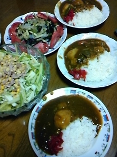 今日は 適当にカレー作りました。なんで適当かというと ニンジンがない・・・・あるものの ピーマン 茄子 じゃが芋 玉ねぎ ひき肉で作ったカレーです。セロリとツナのサラダ わかめサラダもあります。 長女が帰国後 家でまったりしている日が多いのでちょこっとドライブや お買い物しています。今夜はワインを買ってきたのでメルシャンの甘口の赤 飲みやすいのでゴクゴクいけちゃいますよー にほんブログ村 にほんブログ村