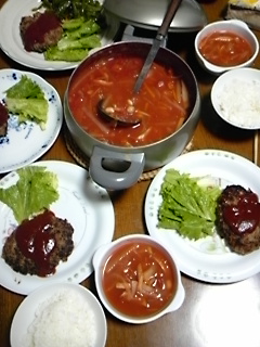 こんばんはー急に寒くなっちゃって困ったお天気ですね。朝から雨で 一日降ったり止んだり 皆さん 風邪引きませんように~ 今夜はハンバーグとスープです。ひき肉さえあれば なんとかなりますものね、ハンバーグ★トマトスープは ごぼう ニンジン 大根 煮豆 ハムが入っています。トマトの水煮缶2缶なのでトマト味が濃くて温まります。隠し味は 醤油と和風だし 砂糖少々でーす疲れやすいとき お腹の調子を整えたいときはトマトスープが定番ですね。 ハンバーグは 甘めのソースでいただきました にほんブログ村にほんブログ村 昨日はおでんをドーーンと作りました。寒くなったので お鍋や熱燗が美味しい季節ですね。パパは夜中に帰ってくるのでかわいそうだけど 出来たては食べれない・・・・笑 さーて デザートは梨にしましょうか・・・・ぶどうにしましょうか・・・・ケーキにしましょうか・・・・
