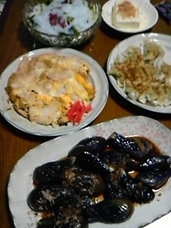 今夜は茄子を焼きましたよー茄子はさっぱりと ポン酢で食べます。 甘辛ーく煮絡めた 鶏胸肉の薄切りを卵でとじました。ご飯にあいますね。長ネギが入っているのですが、こっこれは・・・・ 親子丼とかわりないと気付きましたヒョヘー 笑 海藻とこんにゃくのサラダ 梅ドレッシングでいただきます。 にほんブログ村 にほんブログ村 まだまだ暑い日が続いていますね。クーラーの部屋から 出れませんね。早く秋らしくなって欲しいものでーす