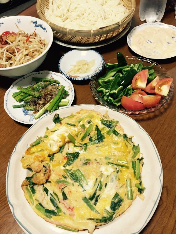 今日も暑かったー 36℃ 偏頭痛がなかなか治らないので あり合わせの夕飯ですよ。 ひやむぎと にらたま 残り物でーす。