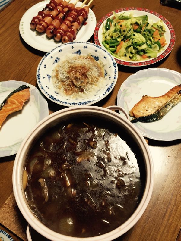昨夜の夕飯です。 ビーフシチューと 鮭ですよ〜 買い物行かなかったので こんな感じになりました。 今は 鮭も美味しいですよねー