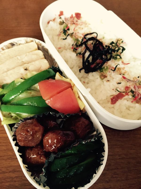 今日はミートボール弁当。 キャベツとピーマンのカレー炒めも入れました。 ご飯には 梅干しシラスのふりかけをたっぷりと入れて。 今日は いい日かなぁーと 思いきや 雲ってしまったりー 布団干しやめて 使っていない部屋のお片づけをします。 思いきって 断捨離しないとなあー