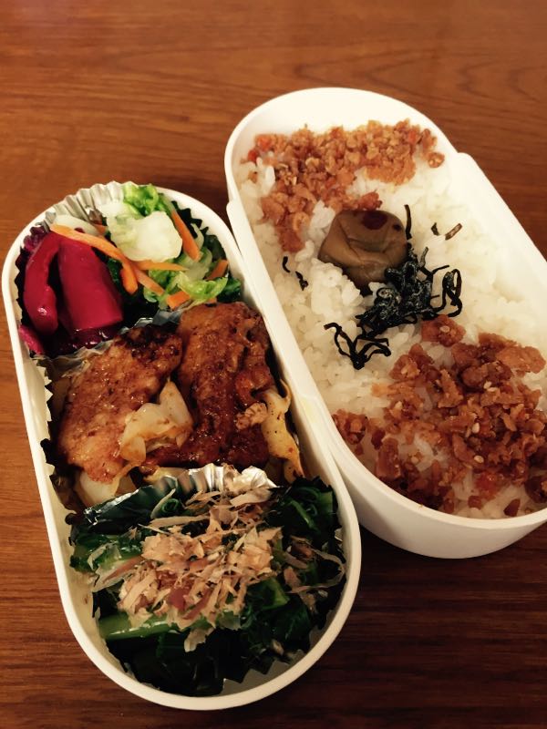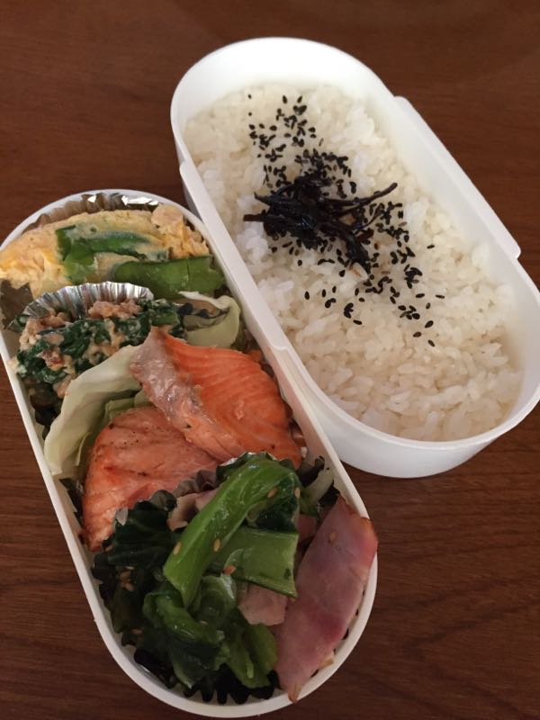 晴れてるけど 風がすごくて 洗濯物が飛んでしまいそうです。 シャケを焼いて 野菜を炒めたり 茹でたり 絹さやの卵とじなど だくさん入れました。 どうみても お父さんのお弁当ですね。 昨日は 沼田にりんご狩りに行って 帰りに昭和町の道の駅で たくさん野菜買って来ました。 漬け物 酢の物 炒め物 和え物 作り置きたーっぷりです。