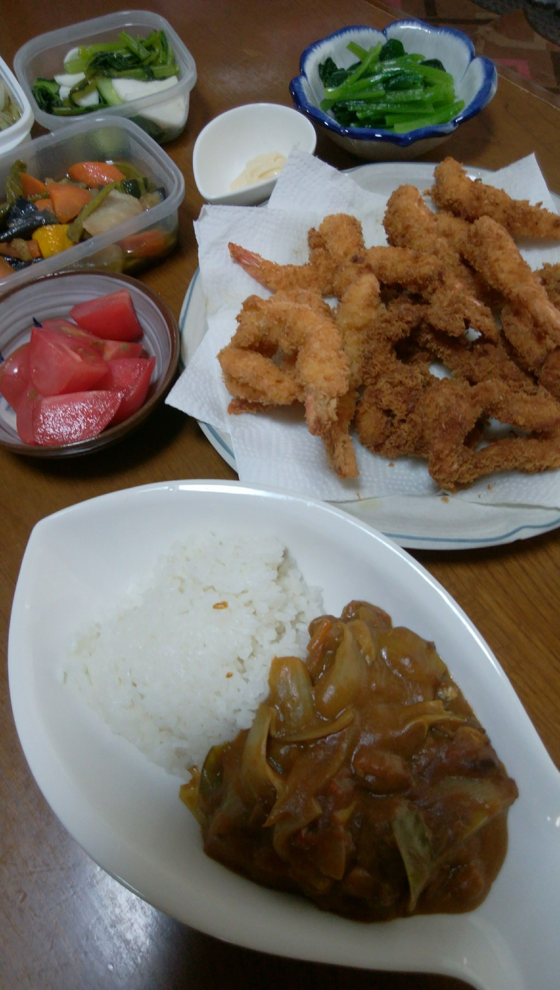 今夜のばんごはん 無加水鍋でつくった野菜カレーと エビフライ イカリング。 トマトが4つくらい入っていて まったく水を使っていないカレーです。 ジャガイモやお肉も入れていないのでさわやかな味です。椎茸や舞茸を入れました。 あとは残り物です。 アイリスオーヤマ 無加水鍋 GMKS−20D グレー 鍋 無加水鍋 20cmIH対応 MKS-P20 MKSS-P20送料無料 IH 鍋 ih対応 オーブン 調理器具 素材 うまみ 水分 20cm かわいい 可愛い おしゃれ オシャレ お洒落 セラミック シリコン お手入れ簡単 簡単 料理 調理 便利 アイリスオーヤマ