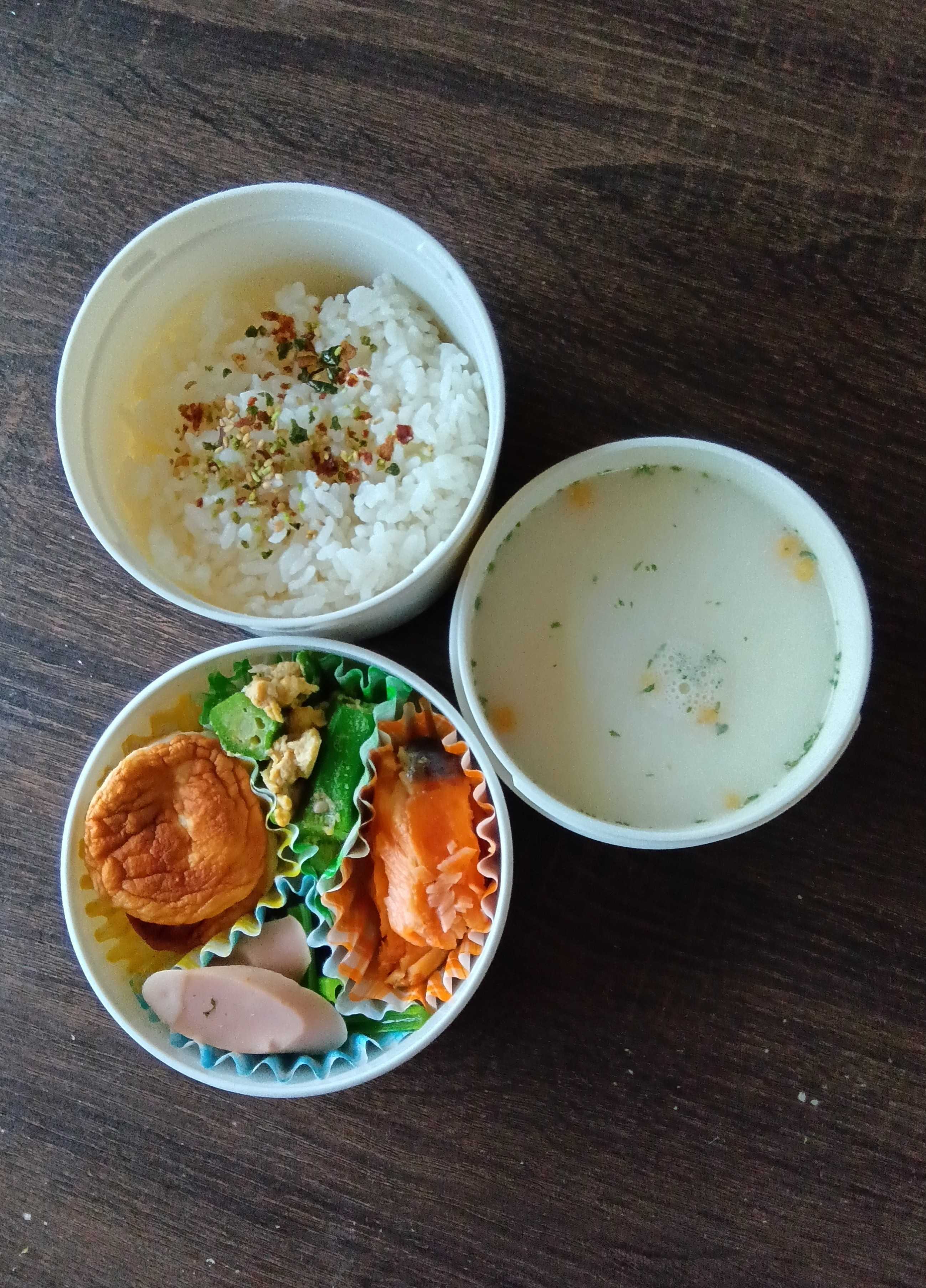暑い日が続いています。朝から暑い。今日のお弁当です。チーズ入りはんぺん小松菜ソーセージ炒め焼き鮭オクラピーマン卵とじご飯(わさびふりかけぱっぱ)ポタージュスープパパ、暑いから倒れないで欲しい。この暑さで69歳の肉体労働はきついはず。無理しないで。左の股関節が痛かったのが、右も痛くなり、ますます歩けなくなったわ。昨日は病院へ電話して会社帰りにパパに薬を取りに寄ってもらったわ。整形外科に行っても医者に変形性股関節症といわれ、リハビリもしたが効果なし。手術しかないと言われちゃう。自分の脚、甘やかさないで動かなきゃ、って少し無理するとすぐ痛くなる。でも動かさないと筋力が落ちるはず。家の中をクルクルまわったり、家事を探したりする。こうしてお弁当作りでキッチンに立つことも晩ご飯を作ったり、キッチンを片付けるのも、リハビリ。少しでもしなきゃならないことで無理してでも立ち続けることが脚の筋力を保つ方法。どうしたらいいのか、痩せて手術するしかないのか〜。痩せる自信はない。[冷蔵] 一正蒲鉾 チーズサンドはんぺん 4個×10袋送料無料2,990円~ 更に2個で600円OFF!3個で1,200円OFFクーポンあり!「有塩or無塩」「骨ありor骨なし」が選べる!⇒銀鮭 切り身 業務用 1kg(約10切れ) 冷凍食品【受賞記念セール】楽天生活応援米
