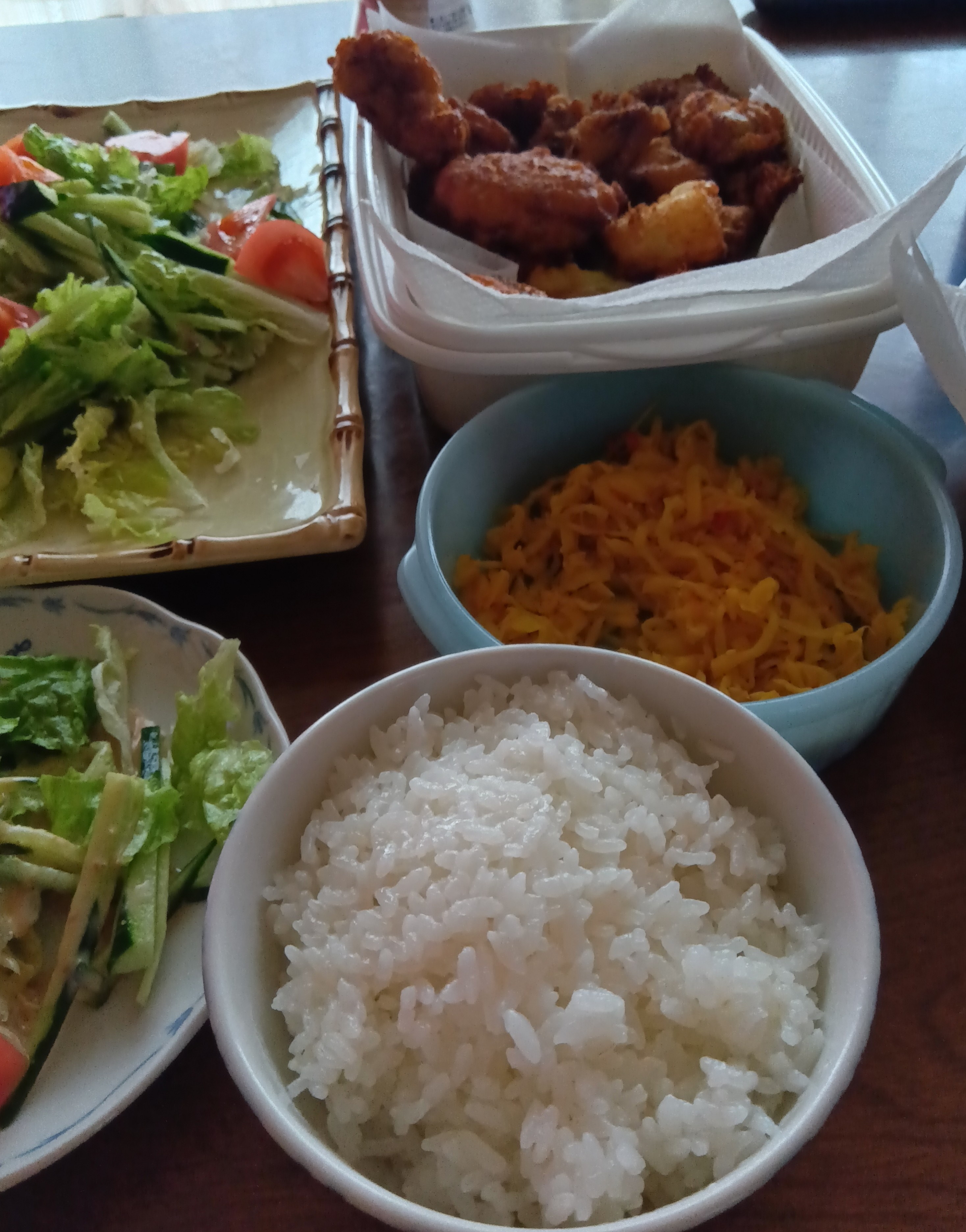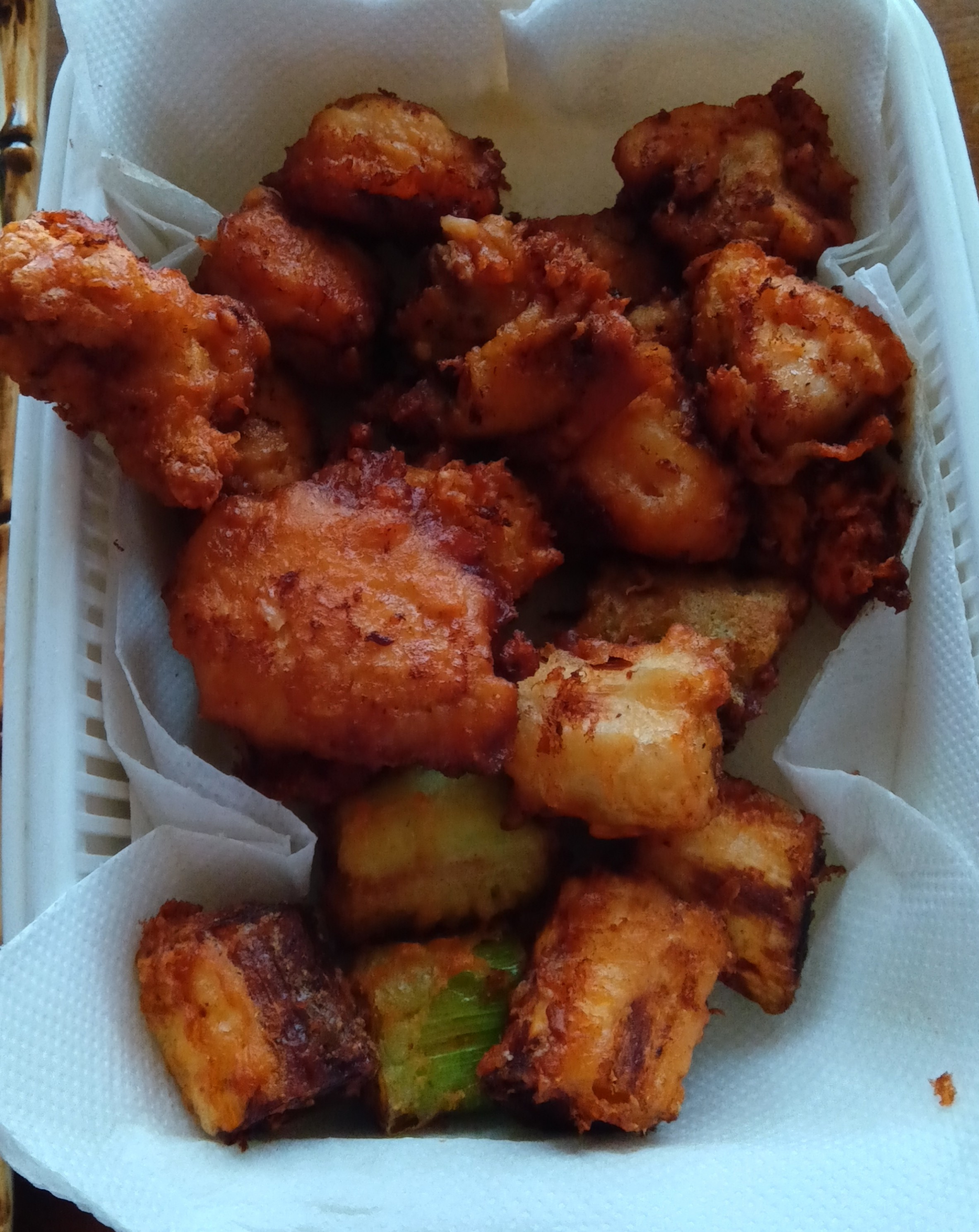 長ねぎのぶつ切り、鶏肉、ワカサギの唐揚げです。