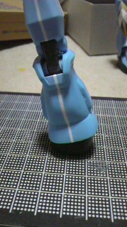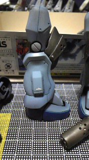 今回は脚部、腕部の塗装です。まず、サフで下地チッェック。続いて、影になる部分と、アーマー裏などに、自作ベースグレーを吹き下地を作りました。で、本格的に色を乗せていきます。カラーリングは、グフのイメージを崩さない様に ブルー系にします。腕部、脚部は、スカイブルー70%+ミディアムブルー30%です。 ↑にほんブログ村 ブログランキング参加中です、応援お願いします♪