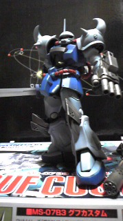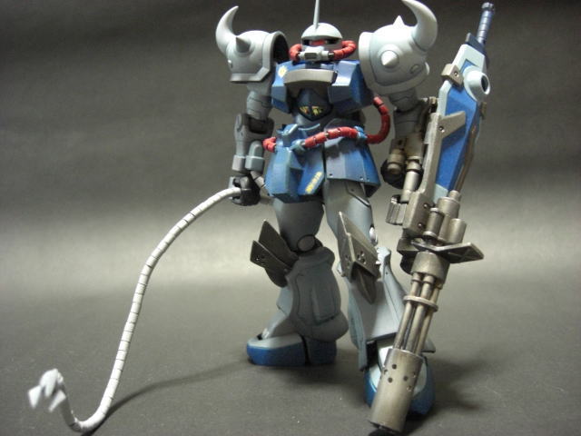 「ケン中尉専用グフカスタム」完成しました♪主な改修点【頭部】※お約束モノアイをHアイズに変更。※動力パイプを手作りパイプに変更。※ひさし部分をパテ盛りし、悪党顔に。【胴体】※胸元を1.2mm厚みを持たせました。※コックピット部分から前かがみに可動可能にしました。※腰の辺りから、左右に可動可能にしました。※フロントアーマー、サイドアーマーを可動可能にしました。※動力パイプを手作りパイプに変更。※ランドセルのバーニアユニットを市販のパーツに変更。【腕】※ショルダーのスパイクシャープ化。※肩の可動範囲を拡げました。【脚部】※全体的に1.2mm厚みを持たせた。※ニーアーマーをシャープ&大型化。※スリッパ部分を爪先立ち出来るようにしました。【武器】※ガトリングシールドを銃身から作り直しました。※ヒートロッドを手作りパイプを使い、作り直し。って、こんな感じです。今回は、コテコテの改造は止め、グフのイメージを崩さない様に製作しました。カラーリングもケンさんが、ブルー系が好きと言うので、元の色に近い感じで塗装しました。が…ハーコン流で、パイプだけは赤にさせて頂きました。ほほほ。あと…撮影時、何箇所か塗装が剥がれました ↑にほんブログ村 ブログランキング参加中です、応援お願いします♪