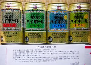 15時頃、おいら宛に何やら宅配便が届いた。何だろう?何か買ったとか、もらったとか、思い当たらないのよね。送り状を見てみたら、送り主は、宝酒造株式会社。えっ!もしかして!早速、箱を開けてみたら、中身は、お酒でした。「TAKARA 焼酎ハイボール」お試し4缶セットプレゼントキャンペーンってやつに応募していたのが、当選したらしい。はて?いったい、いつ応募したのやら・・・。応募したような気もするのだけど、いちいち覚えてないのよね。そんなものじゃない?ま、当選したといっても、お試し缶、つまり試飲用ってことで、応募してれば、ほぼ全員、いや、きっと全員が当選してたような気がするのだが・・・。とにかく、うれしいことに350ml缶が4本!ここのところ、お酒を飲むこともしなかったし、もちろん、買ってもいなかったので、久々にお酒が飲めるわ!しかも、タダ酒!今日・明日は、これで楽しむことにします。
