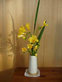 職場の同僚がインフルエンザに感染ということで今日は仕事今週は休みなしになるかも・・。。 先週の土曜日にレンタルボックスでお世話になっているクローバーさんからいただいたフリージアいい香りです。