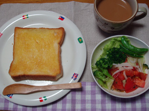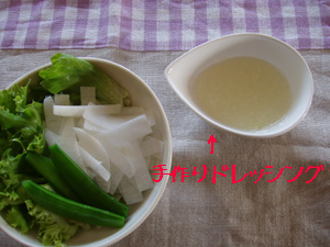先週、1姫☆2姫さんから手作りの玉ねぎドレッシングをいただきました。レタスやら葉野菜が多いこの時期ドレッシングの消費量が多いのでとても助かります。いつもありがとう~今日は久しぶりの休みなのでのんびり朝から野菜サラダを美味しくいただきました。(いつもは慌しくて~トーストだけなのよね・・。)今日はトーストに野菜サラダです。
