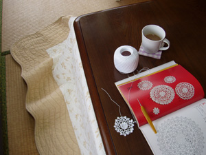 さすがの沖縄も今日は寒いッス。午前中は湯たんぽをかかえてましたが・・・・午後からこたつにカバーをかけて~ぬくぬく ♪編み物も楽しくできます。こたつでレース編みも変だけどまだまだハマっているモチーフ編みをやってます。