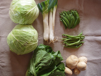 昨日の収穫野菜キャベツレタスいんげんスナックえんどうじゃがいもその他にほうれん草やブロッコリー、からし菜などなど・・・・