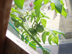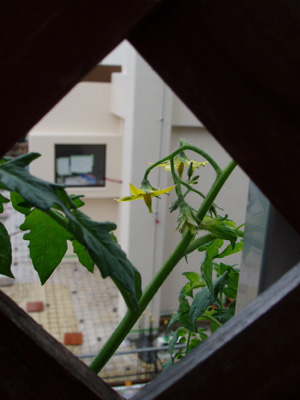 9月ごろにトマトの苗をふたつ植えました。そのひとつにやっと実がつきました♪風にうたれて曲がりくねってなぜかベランダの策の外側に伸びっていってます・・。 もうひとつはまっすぐに成長してこの状態小さな黄色の花を咲かせているのでちゃんと実になってくれるかな~
